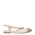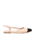 - Metal clasp, duo-tone slingback sandal, black leather toe cap with a matte finish, sophisticated, iconic style
